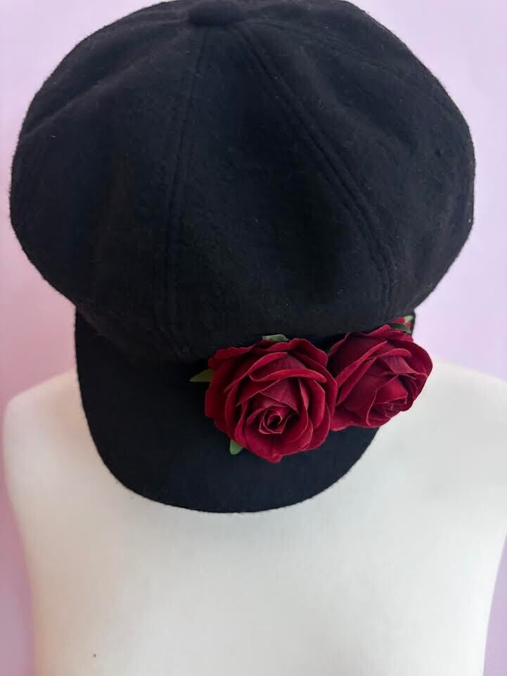 The Rouge Enchanté baker boy hat pairs sleek black with two vivid crimson roses, offering a perfect balance of romantic drama and high-fashion refinement.