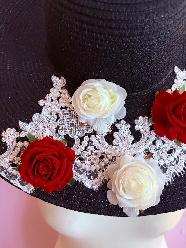 Black straw meets delicate white lace in the Blanc et Rouge sunhat, accented with red and white roses for a perfect balance of dramatic flair and timeless sophistication
