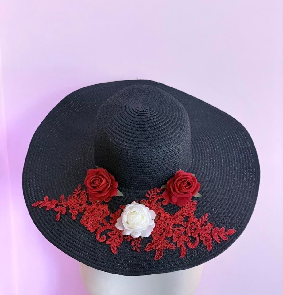 The Rouge Blossom sunhat features black straw, red lace detailing, and a harmonious arrangement of red and white roses. Elegant and dramatic, it elevates any ensemble with high-fashion sophistication.