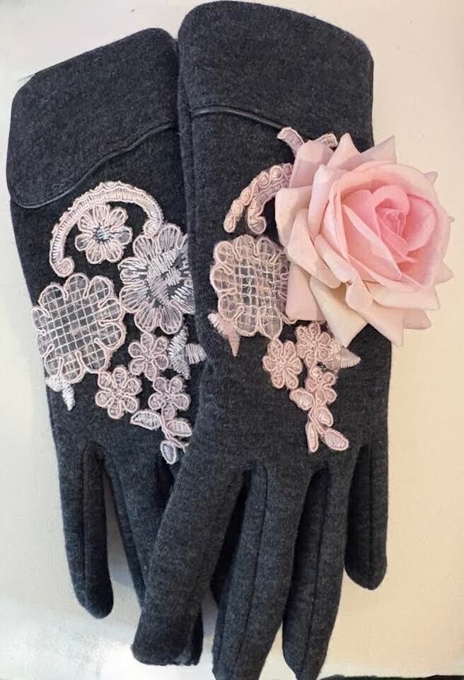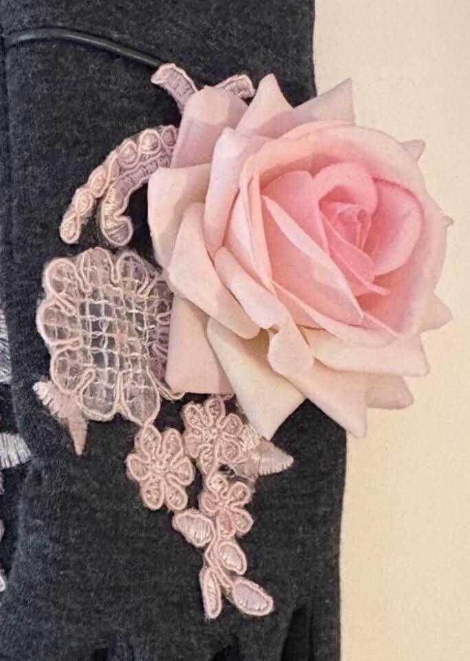 The Ash Petal Gloves combine contemporary grey tones with delicate pink lace accents and a handcrafted rose for a subtle yet striking finish. Ideal for adding a dash of elegance to your winter or formal wardrobe.