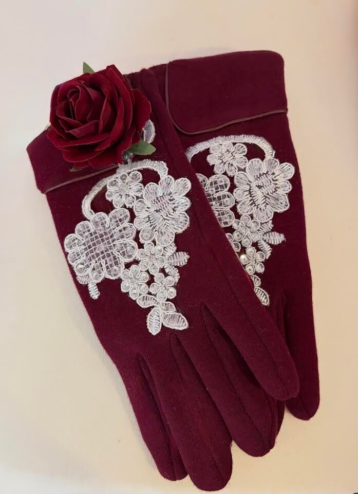 Softly sophisticated, these wine red gloves feature dainty white lace accents and a matching rose embellishment. A graceful nod to vintage charm, they add a whisper of romance to any outfit—from garden parties to elegant soirées