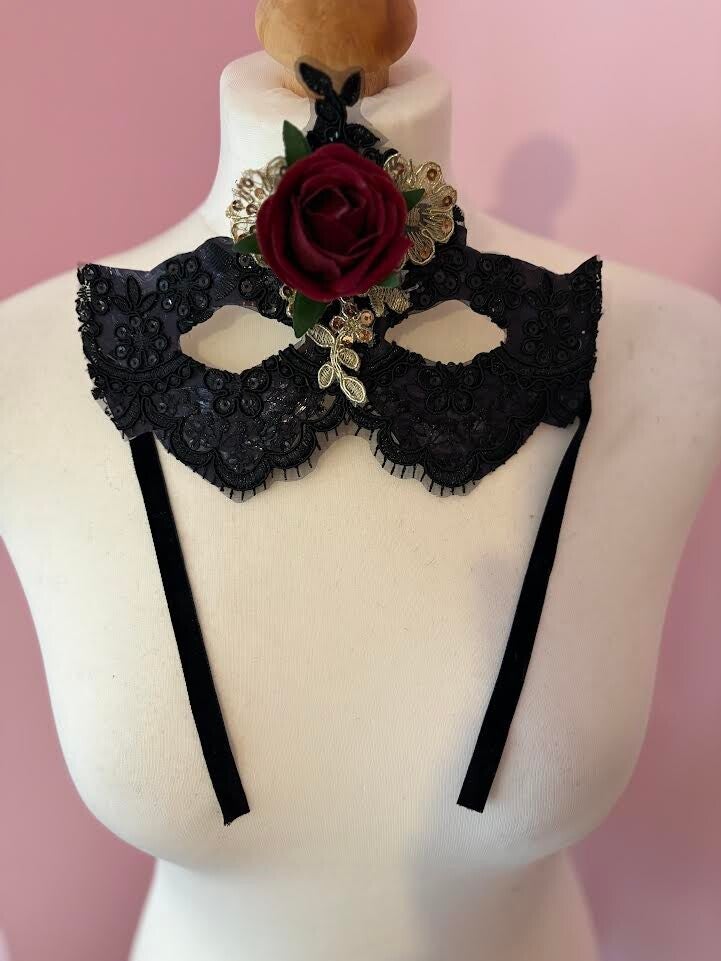Dare to stand out in the Rose of Shadows Mask—a striking black lace masquerade piece accented with gold lace & a dark crimson rose. Designed for mysterious souls and lovers of gothic glamour, this mask turns every entrance into a dramatic statement.