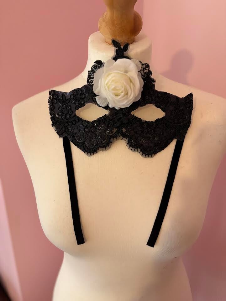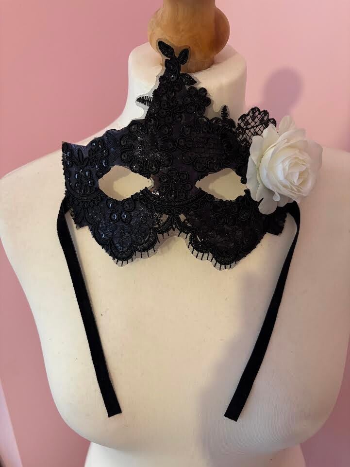 Cloaked in intricate black lace, it’s graced with a single white rose — a symbol of devotion and unspoken love. Mysterious yet pure, this mask embodies the beauty of contrast, perfect for those who walk the line between shadow and light.