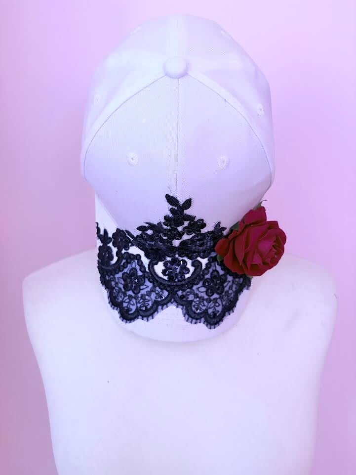 Inspired by ocean nights and timeless beauty, the Sailor’s Rose Cap features white fabric accented with navy lace and a striking dark red rose. A perfect blend of coastal charm and vintage sophistication