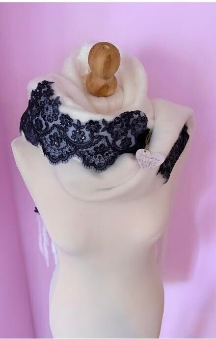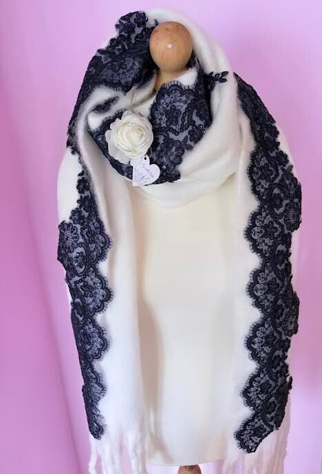 Wrap yourself in refined beauty with this handcrafted white scarf, adorned with delicate navy lace and finished with a soft white rose accent. Lightweight, feminine, and timeless, it’s the perfect touch of elegance for evening wear, special occasions, or elevating your everyday style.
