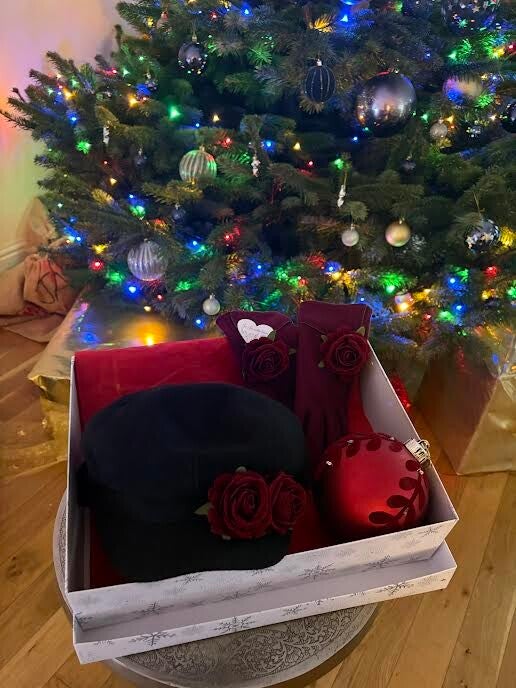 Add a touch of romantic sophistication to your winter style with this beautifully coordinated accessory set. The classic black baker boy hat is adorned with a deep wine-red rose, perfectly paired with matching wine-red gloves featuring the same elegant floral accent. Feminine, timeless, and effortlessly chic—this set brings warmth and charm to any cold-weather outfit