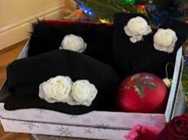 A timeless black baker boy hat paired with sleek black gloves, each adorned with two elegant white roses. This coordinated set delivers classic monochrome style with a soft, romantic touch—perfect for elevating any outfit.