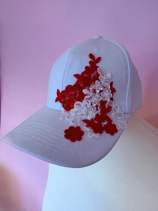 Vivid ruby-red bloom—each stitch rich and bold—intertwine with delicate white lace flowers that shimmer with subtle crystal accents, like dewdrops catching the first light of day. The design flows gracefully from crown to brim, blending casual sporty styling with luxurious artisanal detail. It’s a piece that balances cool sophistication with warm, vibrant charm, as if a cluster of summer blooms was preserved against a serene winter