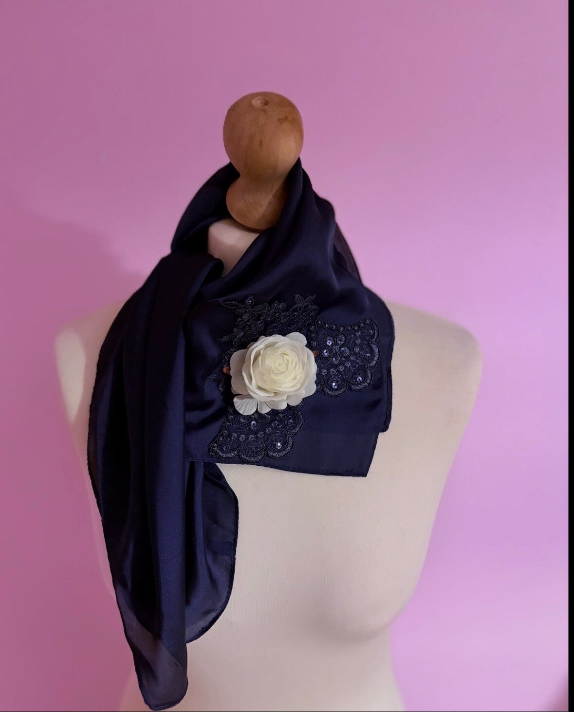 A luxurious midnight blue silk lace scarf adorned with a delicate rose motif, blending elegance and romance. Lightweight and softly textured, it adds a refined, feminine touch to both casual and evening looks.
